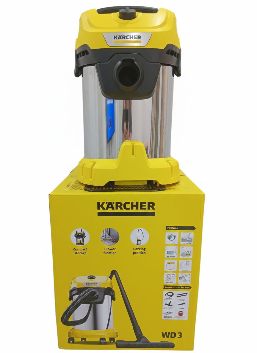 Cette image présente l’aspirateur multifonction Kärcher WD 3 (version avec cuve en acier inoxydable) posé fièrement sur son emballage d’origine. Le tout est détouré sur un fond blanc pur, mettant en valeur le design robuste et professionnel de l’appareil.
